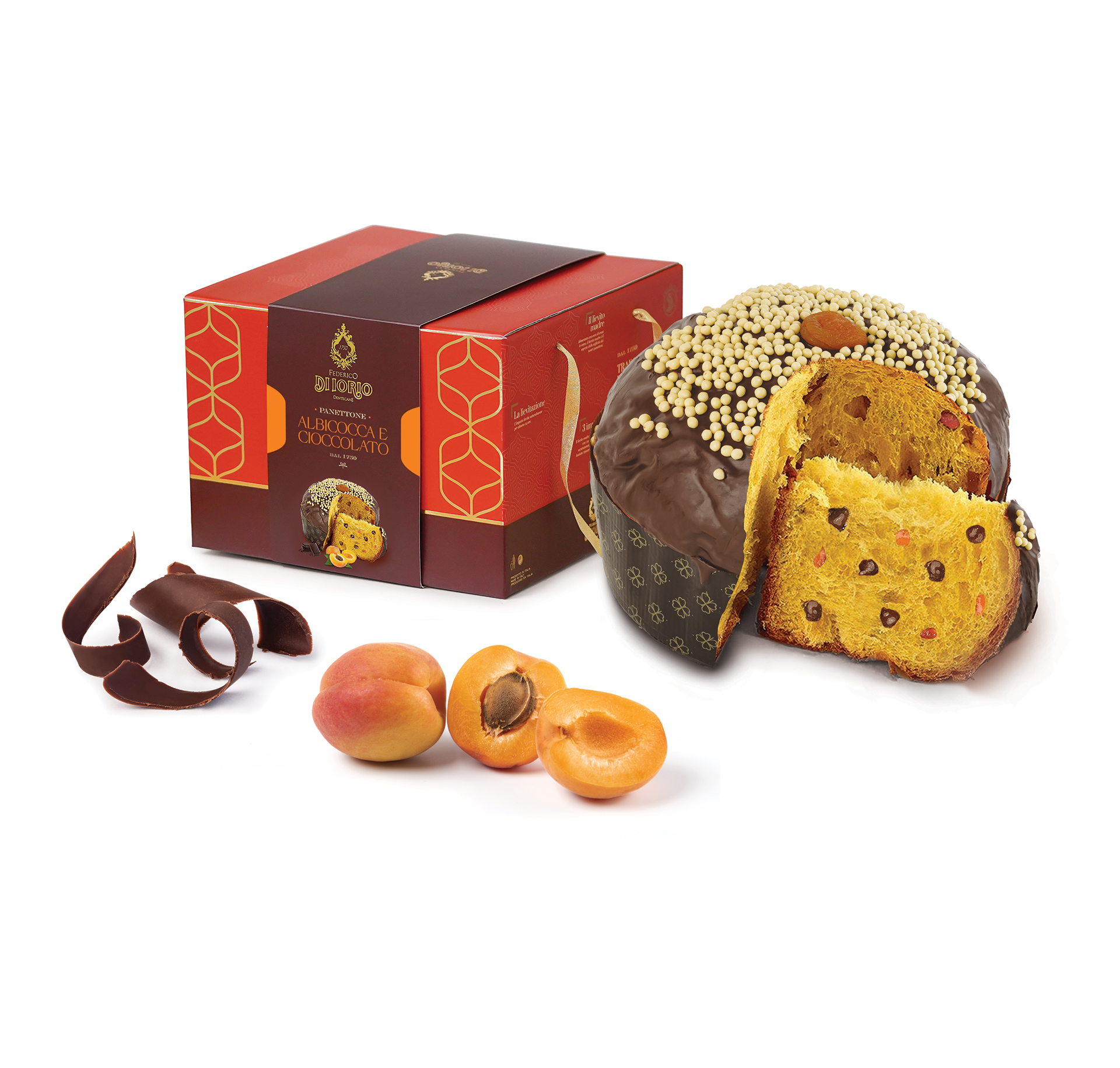 Panettone Albicocca e Cioccolato nasce da uno squisito equilibrio di sapori unici: morbide albicocche disidratate e gocce di purissimo cioccolato fondente. Un’autentica esplosione di gusto e di emozione per un momento che non si vorrebbe finisse mai.
