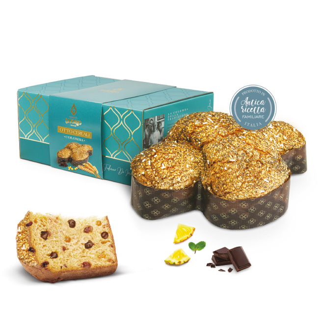 La colomba innovativa, premiata con la Medaglia d’argento dalla Federazione italiana pasticcera (FIPCG), viene preparata unendo al lievito madre un mix di farine di vari tipi di cereali con l’aggiunta di pepite di cioccolato fondente e gustosi pezzi di ananas.
